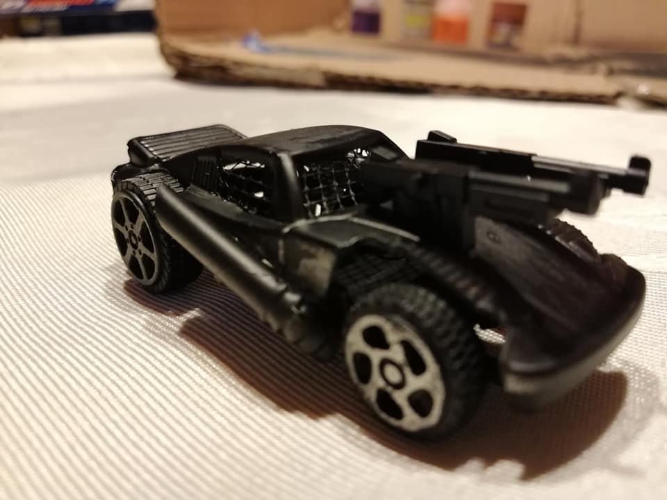 Y llegó la pintura. Decidí colocarle una capa de púrpura en el chasis, y dejar la parte del techo y las barras de color negro. Pinté las luces de amarillo. Al spoiler y las ventilaciones del capó las pinté de azul, y las mallas de color cobre. Para los tubos de escape utilicé un gris metálico, lo mismo que para parte de las metralletas y la parte central de las ruedas. una vez que terminé, le hice una pasada con naranja con pincel seco a los tubos de escape, las ruedas y otras partes, para simular óxido. Y voilá.
