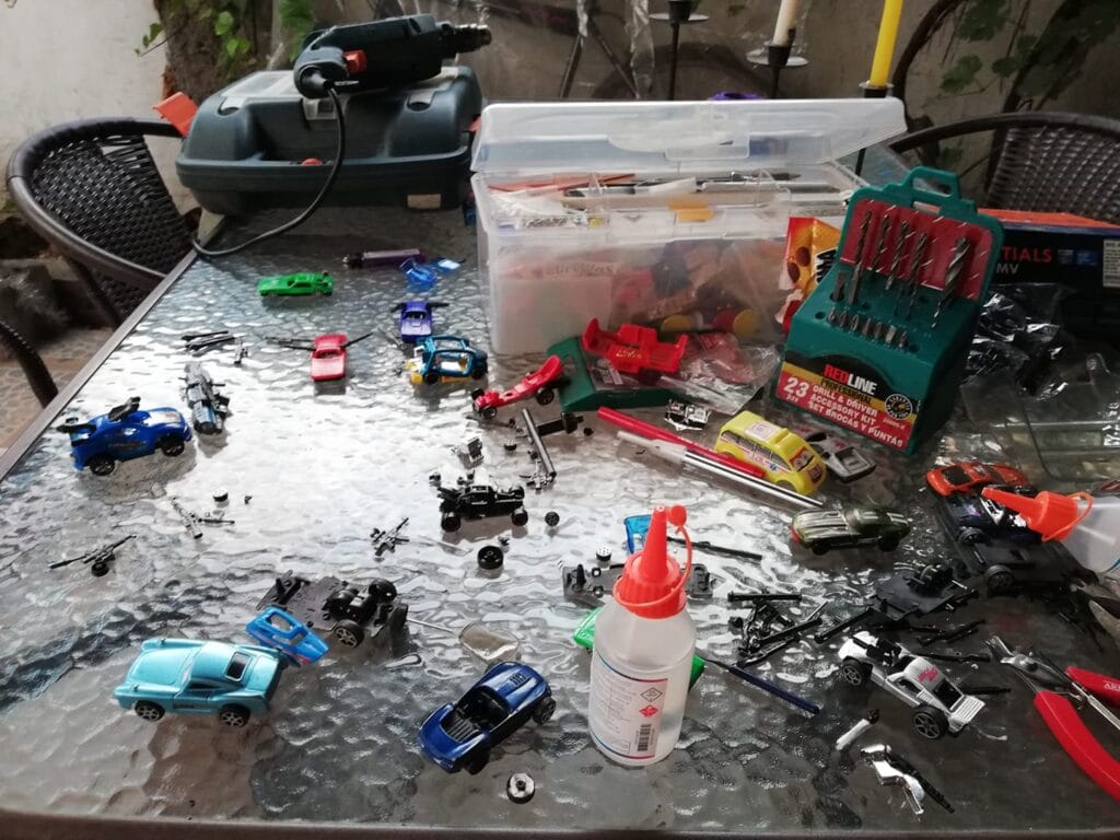 El día de tunning. Con los pedazos de autos, herramientas y la ayuda de mi hijo, que también quiso fabricar los propios.