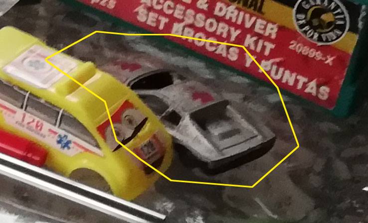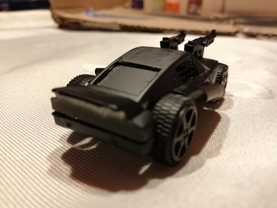 No le saqué fotos al auto sin modificar. Pero encontré esta que es de uno similar. Si ponen atención, verán que las ruedas son pequeñas y el auto tiene un perfil bajo. Es de esos baratos de plástico, plomo, con algunas figuras rojas en el capó y el techo.